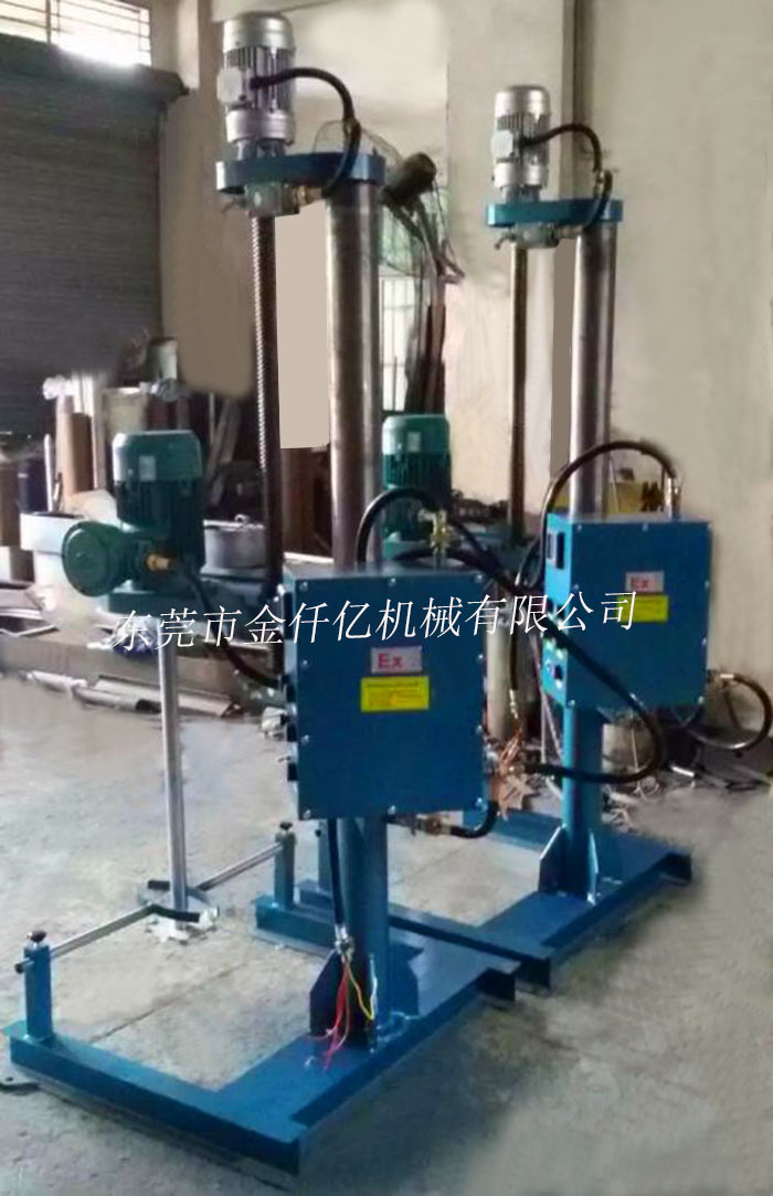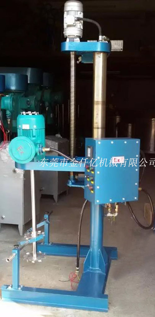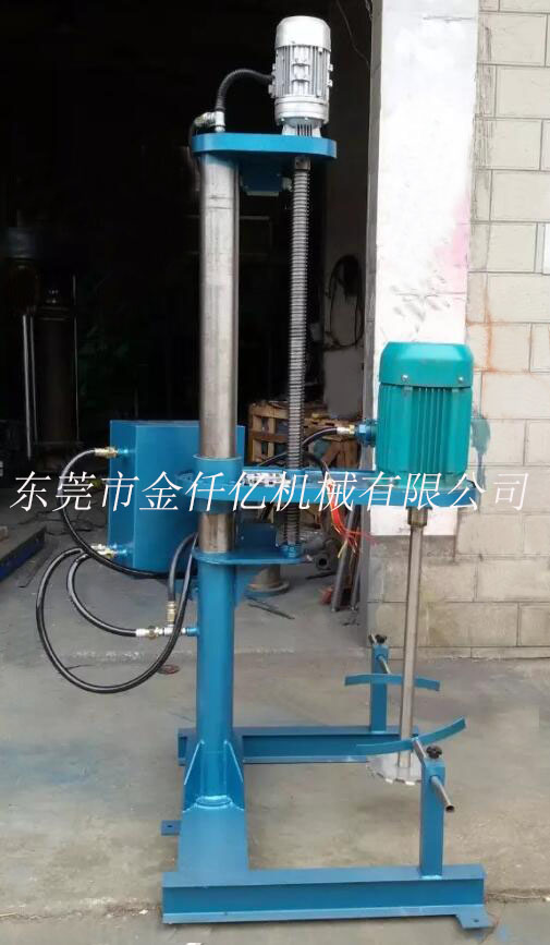 本機由機架、腰板、絲桿、分散軸、分散輪、減速機、馬達及控制柜等組成。機架升降為機械傳動,升降平穩可靠。機架為固立式單桶攪拌。